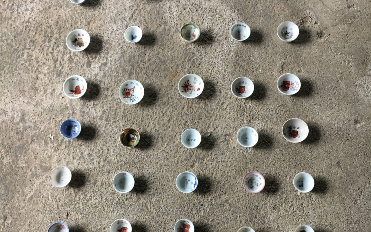 美術家で出ヶ原紙職人でもある滝澤徹也氏とコラボレーションし、襖作品や絵画作品などを製作。素材には、優れた教師であった楢山集落の先人の蔵書、古い藁細工などを使用しました。それらを周辺地域にて採取した楮に混ぜ込み、集落内にある山の神様(祠)が見守る池の水で漉いたものです。古民家の屋根裏の煤や、キラキラと雲母の混じった池の砂、楮を組み合わせ、池の波形を使って紙を漉き、集落から眺める山波や雲海の景色を生み出し、土地の記憶を繋ぐサイトスペシフィックな作品が誕生しました。